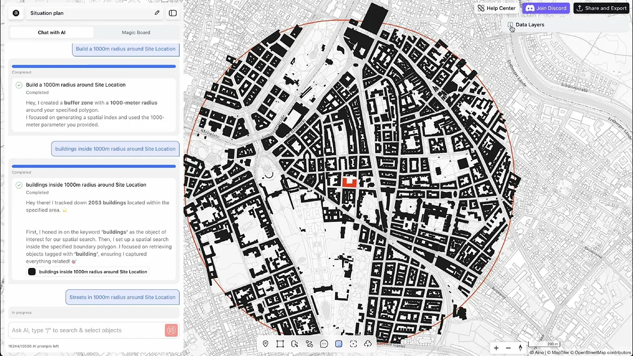 Explain your task to Aino, and AI handles the heavy lifting: spatial data retrieval, analysis, calculations, and visualization.