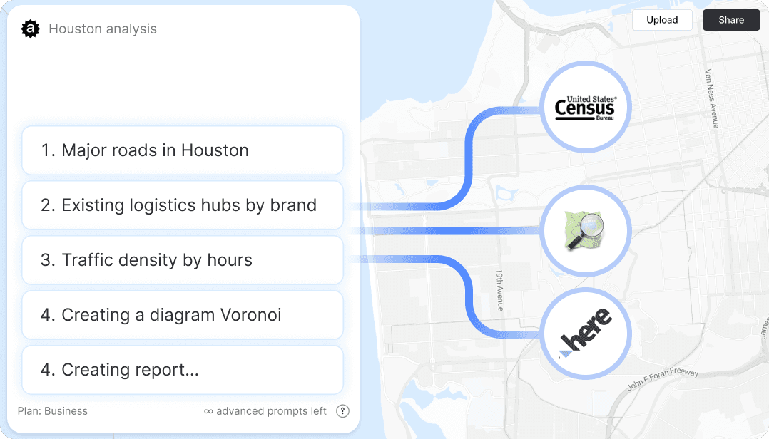 Maps, trade areas, mobility flows, and customer demographics are automated and visualized within minutes.
