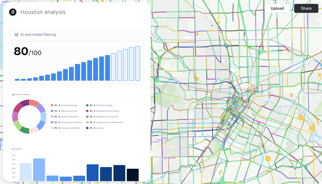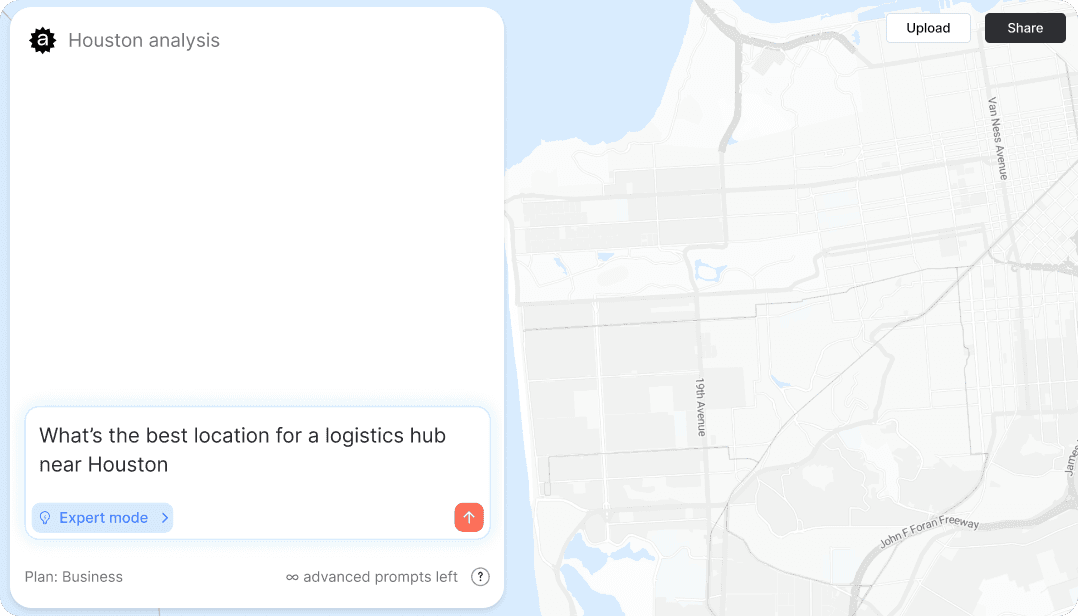 Type your question about any location. Aino's AI will design the methodology and run the analysis—no coding needed.